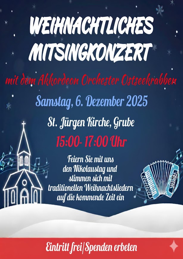 Am Samstag, 6. Dezember laden wir zum "Weihnachtlichen Mitsingkonzert" in die St.-Jürgen-Kirche in Grube ein.
